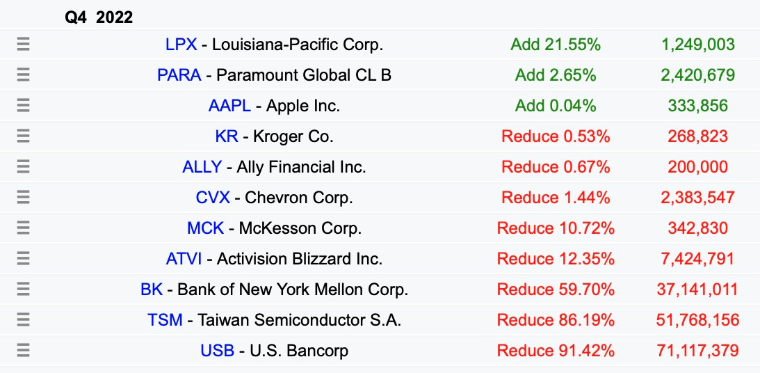 After picking my jaw up off the floor from the TSMC sell-off, I was thrilled to see modest additions to the Paramount and Apple positions. Berkshire bought another 2.4 million shares of PARA 0.00%↑ in Q4, boosting its overall stake to about 15.4% of the streamer's Class B (non-voting) stock. Paramount is the only company that Berkshire purchased in all four quarters of 2022.