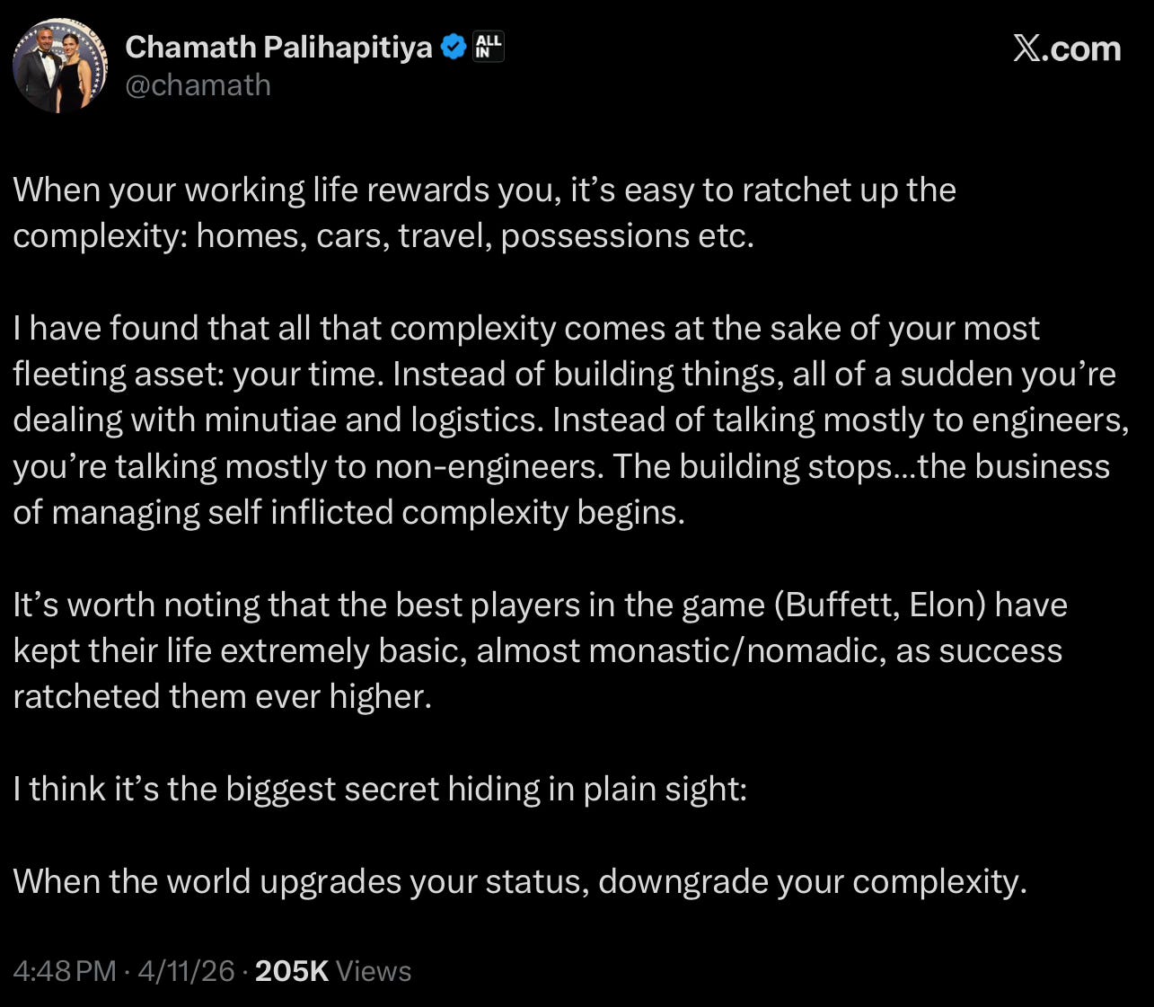 (3) Chamath Palihapitiya of the All-In Podcast mentioned Buffett over on X in a post about how success often leads to a more complex life. And he was smart to do so — because this is something Buffett figured out long ago. He still lives in the same Omaha house he bought in 1958. Same hobbies. Same diet. Same routines. Buffett simply refused to accept the burdens that come with complexity.