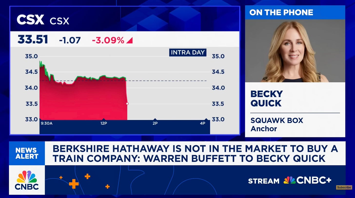 Then, earlier this week, Becky Quick scored another big scoop on these BNSF plans from Warren Buffett himself. She spoke to the Oracle by phone and then hopped on CNBC to relay his clear message: “Berkshire Hathaway is not in the market to buy a train company right now.” Buffett told her that he and Greg Abel met with CSX CEO Joe Hinrichs in Omaha on August 3. “They talked through all of it,” she said, “and Buffett and Abel made clear at that point that they were not going to be making a bid for CSX. But they really thought there was a lot that they could do to cooperate and work together and come up with those same synergies that there would be if the two companies were combined.”