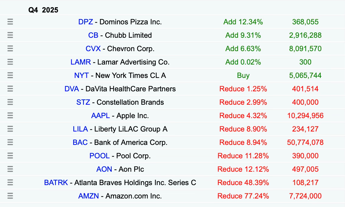 On the sell side, Berkshire slashed its stake in the Atlanta Braves by nearly half and in Amazon by even more. For everything else, the chart above shows all of the portfolio’s ins and outs during Q4 2025. (Later on Tuesday, we also got another filing that revealed Berkshire sold ~330,000 shares of Liberty Live Series C stock in January.)