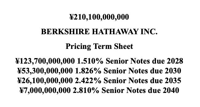 Berkshire returned to the Japanese bond market this week — issuing ¥210.1 billion ($1.4 billion) in yen-denominated debt. Buffett and co. locked in low rates ranging from 1.51% for the 2028 maturities up to 2.81% for those coming due in 2040. As usual, this latest foray into yen bonds spurred speculation that the raised capital will be used to top up Berkshire’s stakes in its favored Japanese trading houses. Time will tell.